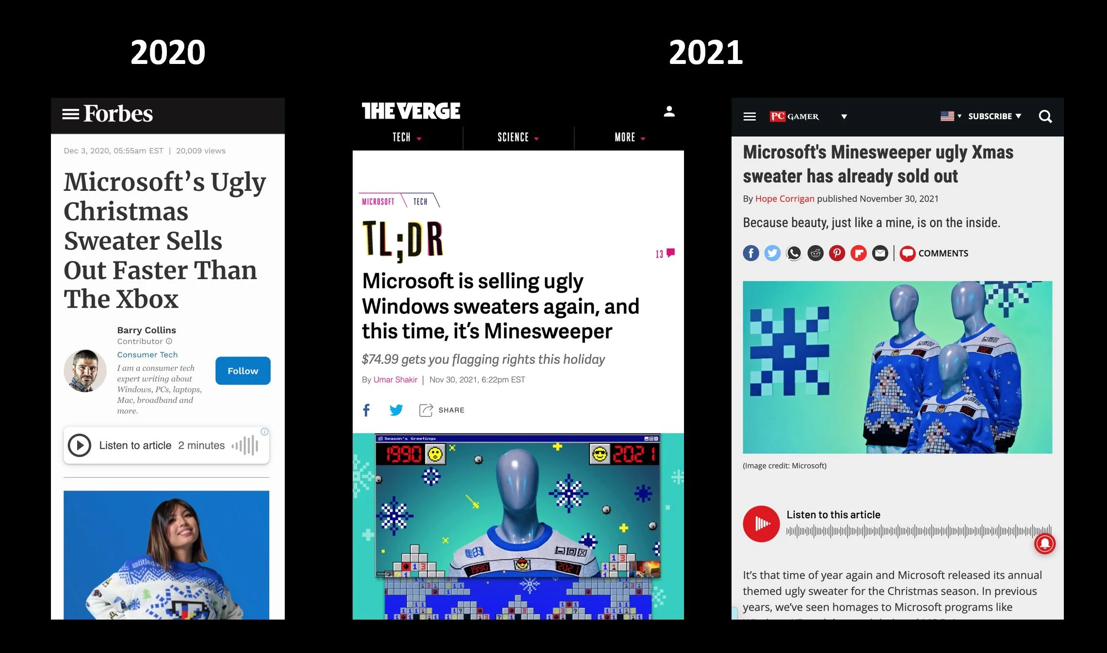 During my time on Windows, we established a great holiday tradition that turned the things fans love and remember most about Windows into nostalgic, ugly apparel. Since Windows is a software company, not a soft-wear company, we found a worthy, relevant cause each year to give all the proceeds. That’s good fun.